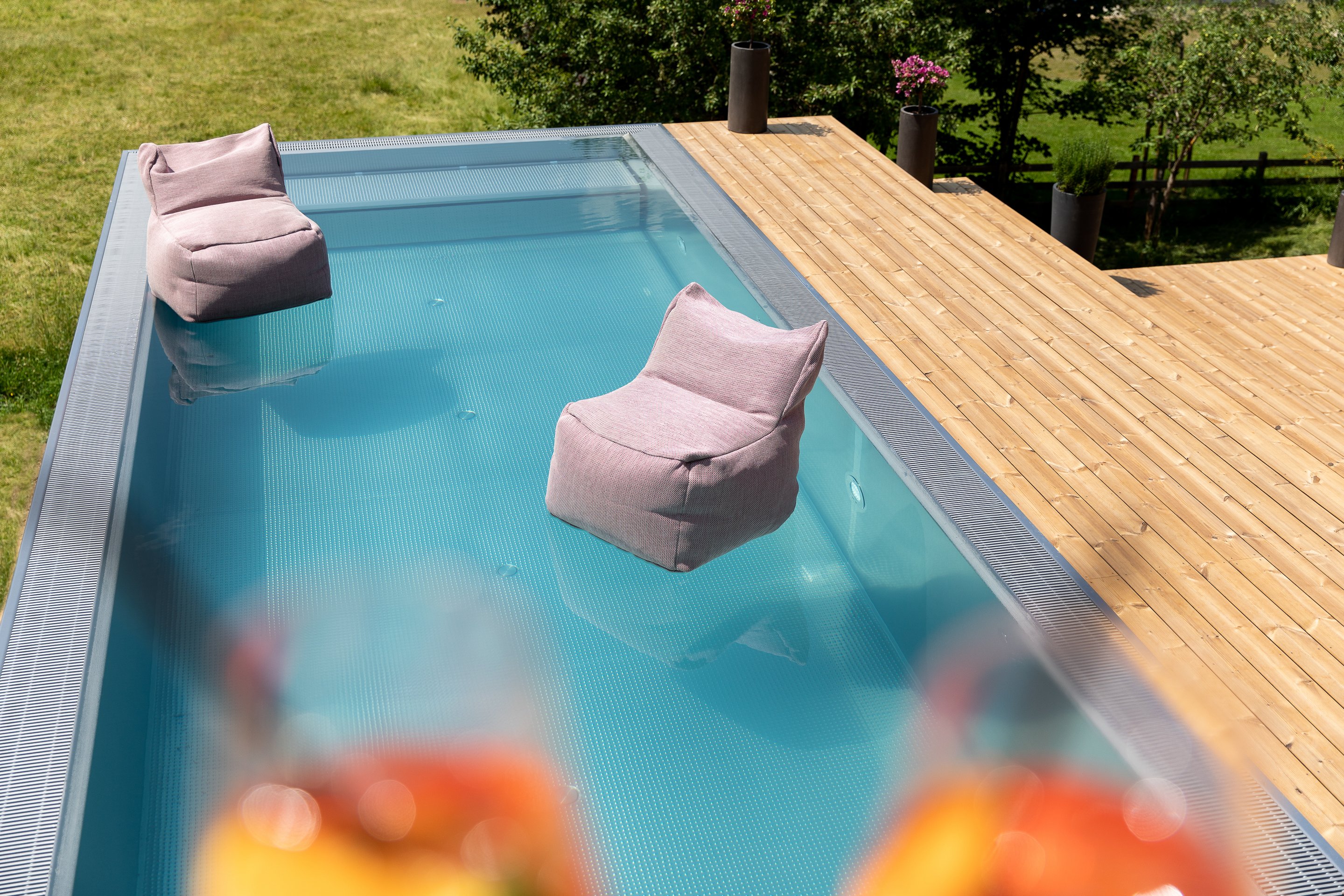 Im Almmonte Design geschaffen ist der ganzjährig beheizte Infinity Outdoor Pool